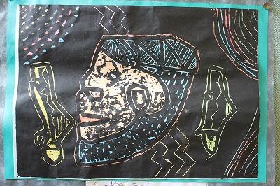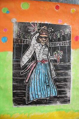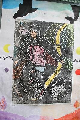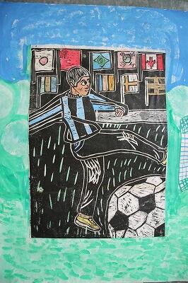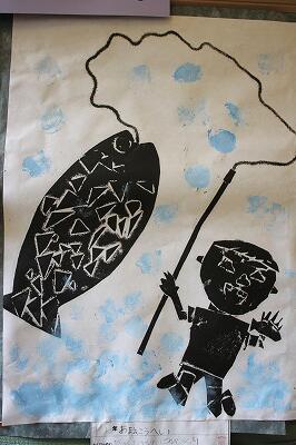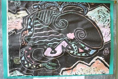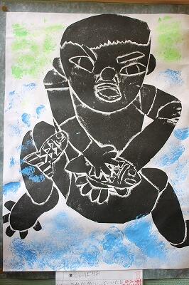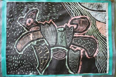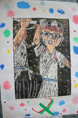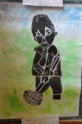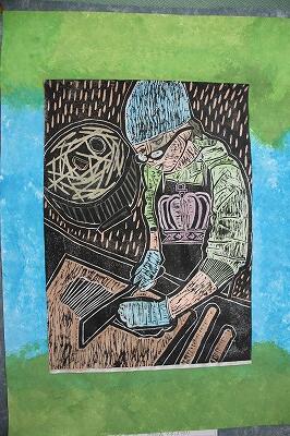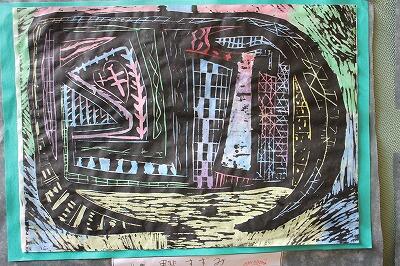 5・6年生も木版画多色刷りです。色は裏から塗りました。台紙にも自分なりの工夫をしています。