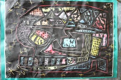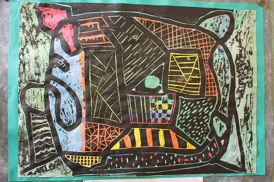 3・4年生は木版画の多色刷りに挑戦しました。色は裏から塗りました。彫刻刀を使って彫った形をもとに、自分なりにイメージしたものに仕上げました。個性あふれる作品になりました。