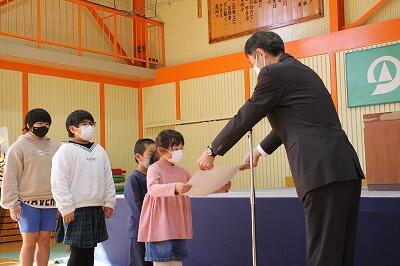 全校集会では、人権作品や動物作品コンクール、村陸上大会の表彰も行いました。
