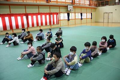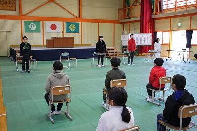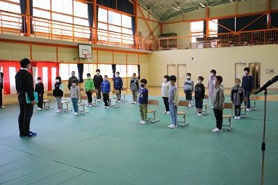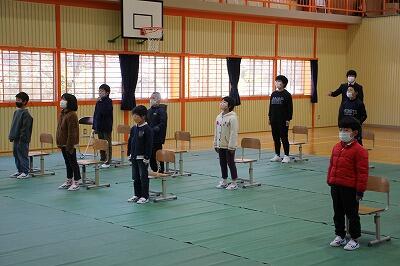 今日はお別れ集会の様子を紹介します。体育館で実施する予定でしたが、あまりの寒さ(氷点下)のためマルチパーパスに変更しました。