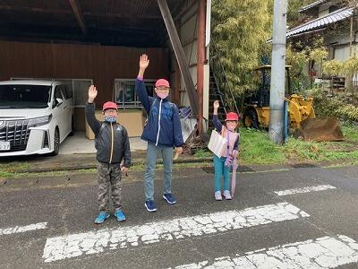 その後、道路に設定した交差点を使って、横断歩道の渡り方の練習をしました(「信号ヨシ!」が言えました)。信号機がない場合とある場合、車が来た場合などを想定して練習しました。上級生が下級生にやさしく教える場面も見られました。