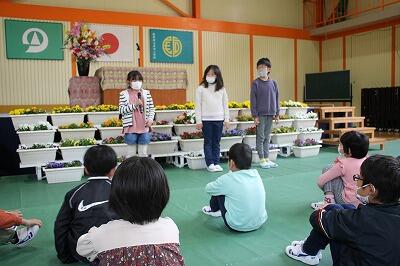 1・2年生、3・4年生、5年生の順で、6年生への感謝の言葉やプレゼントをしました。