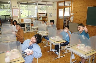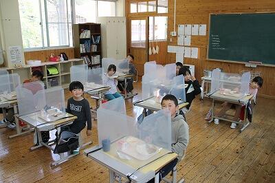 給食時間には、児童一人一人の机にパーテーションを置いていましたが、昨日から使用しないこととしました。およそ3年ぶりに広い視界のもとで食事ができます。子どもたちはとても嬉しそうでした。(昨年度に着任した私にとって、このような写真が撮れるのは初めてです。)