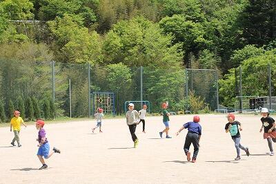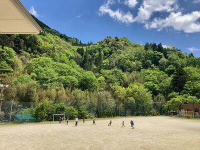 3枚目の写真は、青空の下で子どもたちと先生が昼休みにサッカーを楽しんでいる様子です。青空と新緑のコントラストが見事です。素晴らしい光景だと思います。