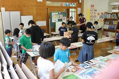 子どもたちは、本屋さんのように並べられた本に驚き、目を輝かせながら興味のある本を探していました。