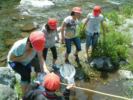 ・ 3時間目に5年生が学校すぐ横の川で、川の生物を捜していました。あみで、メダカと言いながら、はえの子どもと思われる小魚をすくっていました。天気も良く、川面がきらきらと光ってとても気持ちが良かったです。明日は土曜日なので、ここでも釣り人が糸を垂れることだろうと思ったところでした。