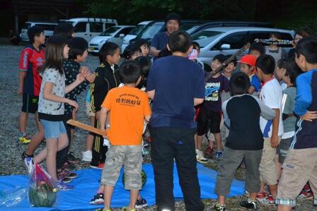 初日の夜には、ホームスティ先の保護者全員が「歓迎会」を開催して下さいました。焼き肉を はじめ、たくさんのごちそうを子ども達はたのしそうにいただいていました。また、大人は大人同 士で、引率の先生を含めて交流を深めることができました。開催していただいたことに心から感 謝です。写真は、スイカ割りの様子です。