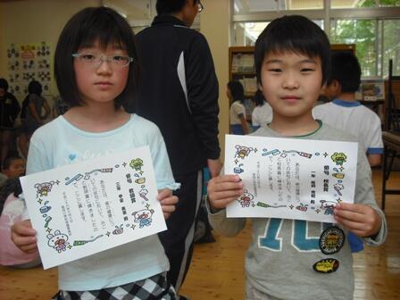 ・ 養護教諭が中心となり、児童の「歯」に関する意識を高めるために、「歯」に関する俳句のコンクールを開催してくれました。一年生から六年生までの作品の中から2点を校長賞、教頭賞として表彰しました。写真は、その二人です。