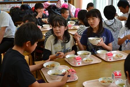 そば打ち体験では、講師や保護者の方々に手順を教えていただきながら活動をし、そばを打った後、全員で試食を行いました。自分たちで栽培したそばの味は格別のようでした。子どもたちは、これまでの活動を思い出しながら、おいしくそばをいただいていました。