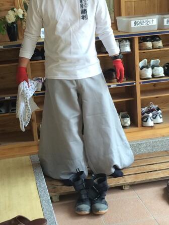 ・ 職員の一人が、住宅横の草払いをするからと、気合いの入った「ニッカズボン」をはいて来ました。このズボンは、昨年受け持った保護者がはいていたのを気に入って購入した物です。今回が初めての着用かな?という感じですが、いかにも草払いはベテランのように見えます。しかし、草払いをするのは、実は二回目だそうです。Tシャツも気合いの入ったのを着てきました。もちろん、この時間は、勤務時間終了後のことです。