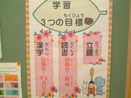 ・ 写真の「学習目標」が以前から階段の掲示板に掲示してあります。学力向上の取組を受けて、担当が職員会で提案したものを児童向けに作ったポスターです。現在、各学級で指導を推進しているところです。三つのことが確実に児童にも浸透するよう、職員には日々の指導で頑張ってもらわなくてはなりません。