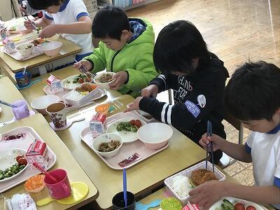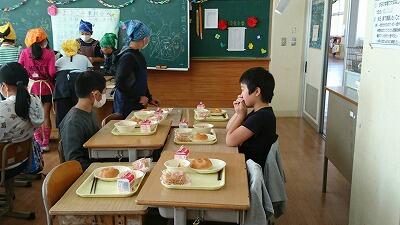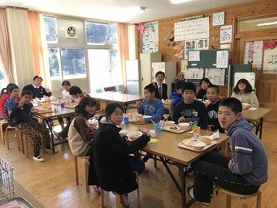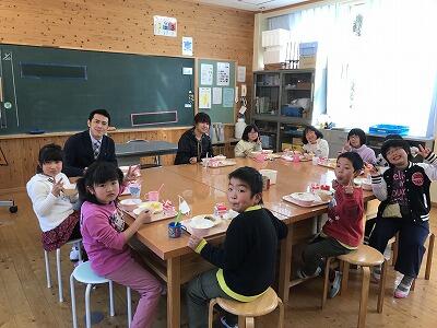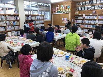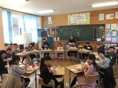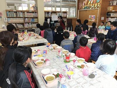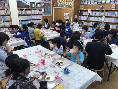 1年生から4年生はマルチパーパスで、5.6年生は教室で、子どもたちと楽しい給食の一時を過ごしていただきました。