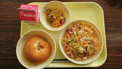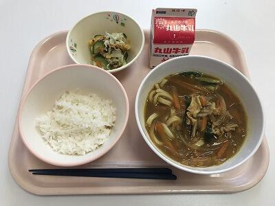 今日の給食は、ゆかりごはん、鶏ごぼううどん、野菜のみそアーモンド和え、牛乳でした。