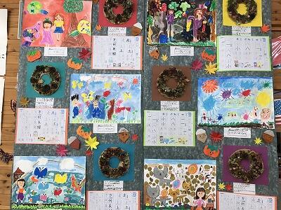 【1年生の生活科の様子です。 木の実を使ってクリスマス用のリースを作っています】↓