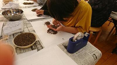 【学校に戻り、刈り取った蕎麦をシートの上で、歌を歌いながら棒で叩きあやした後、昔の道具の唐箕(とうみ)を使い蕎麦の実とそれ以外のものとに仕分けします。】↓