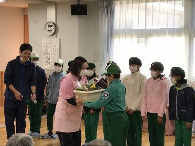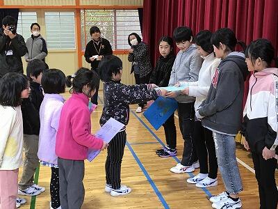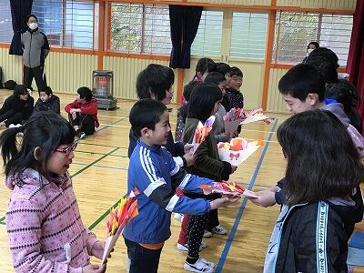 1.2年生からは、6年生にお礼のお手紙のプレゼント。3.4年生からは、色紙で折った花束とエールのプレゼント。5年生からは、6年生、一人一人を一文字にたとえた色紙のプレゼントを贈りました。6年生からは、お礼に、間違い探しゲームのプレゼントをしてもらいました。