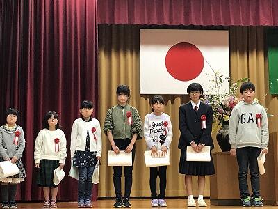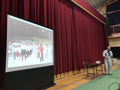 代表で6年男子ソフトボール投げで優勝した児童を、全校児童の前で表彰しました。