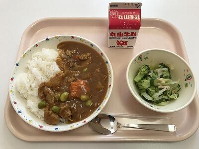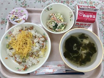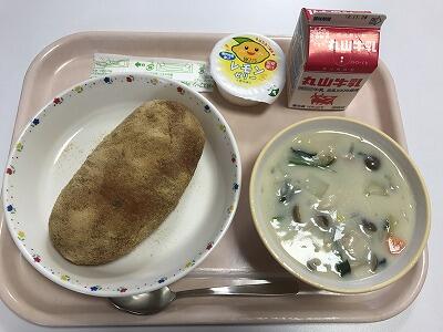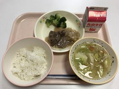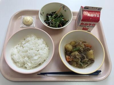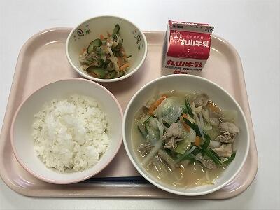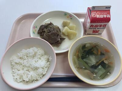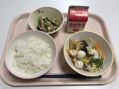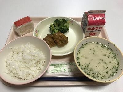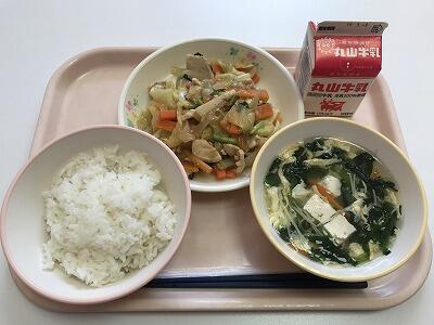 今日の給食は、麦ご飯、かき玉汁、鶏肉と野菜のみそ炒め、牛乳でした。