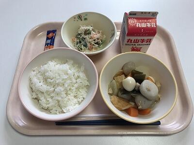 今日の給食は、麦ご飯、おでん煮、和風和え、ふりかけ、牛乳でした。