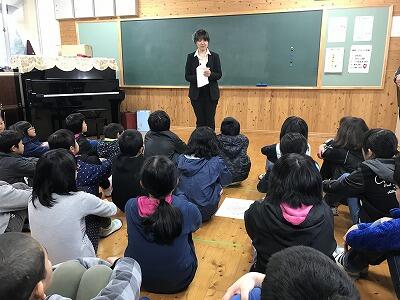 25日(木)、アコースティックギターリストで、シンガーソングライターの黒木 瞳さんと、バイオリニストの岩出なつみさんが、東京から尾向小学校に来校し、子どもたちのために音楽集会を開いてくださいました。