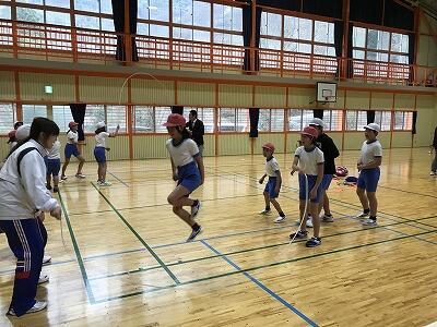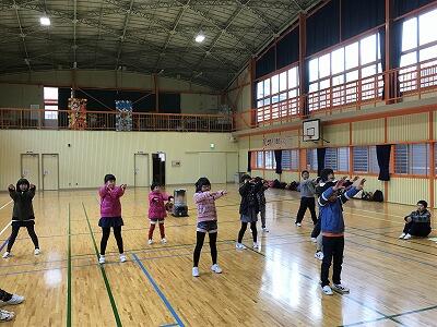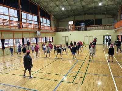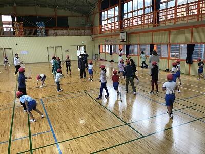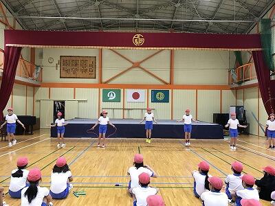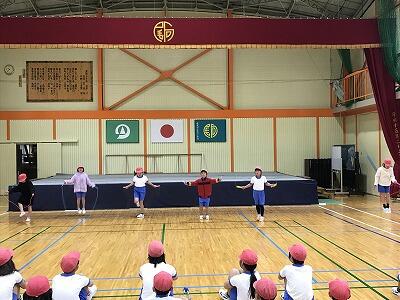 【2日目の始まり。 3.4校時はなわとび発表会です。準備運動もしっかりやります】↓