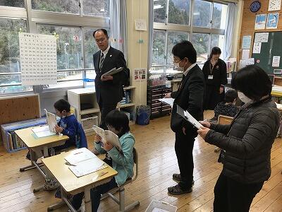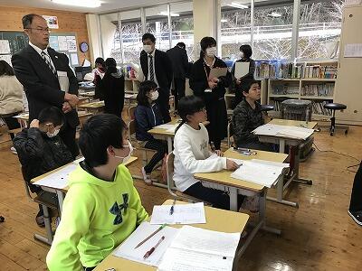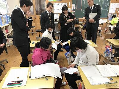 県教育研修センターから1名、村教育委員会から5名の方々に来校していただき、2校時に3.4年生の算数、5.6年生の算数、3校時に1.2年生の算数の授業を参観していただきました。4校時には、参観していただいた指導主事の先生方から、授業者に対して、授業についてアドバイス等のフィードバックをしていただきました。今回が3回目で、前回9月の授業で出された、課題が改善された授業を見ていただきました。3名の先生方の授業の発問、教材教具の工夫等、事前にしっかり準備され本日の授業を提供していただきました。
