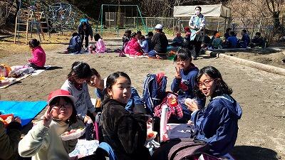 昼食は、「お弁当の日」も兼ねていたので、朝早く起きて、自分たちで作ったお弁当を広げて不土野小のお友だちと、各班毎に別れておしゃべりをたくさんしながら、楽しい一時を過ごすことができました。