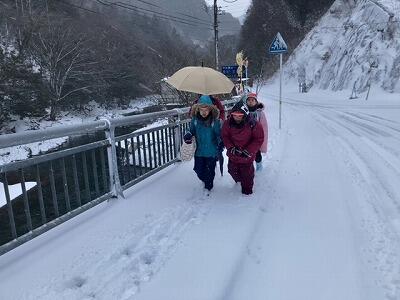 2~4枚目の写真は、翌日(1月25日)の朝の道路状況です。毎朝校長が立っている不土野郵便局前です。とけた雪が道路に残り、凍結してアイスバーン状態になっています。長靴で氷の上に乗ってみましたが、試すだけでもこけそうになりました。郵便局の奥から下りてくる向山(むかいやま)の皆さんは、かなりスピードを落として運転されていました。向山地区(追手納・日当・日添)の道路は、さらに厳しい状況だったそうです。消防団の皆様が、雪をどけたり氷をとかしたりしてくださったそうです。