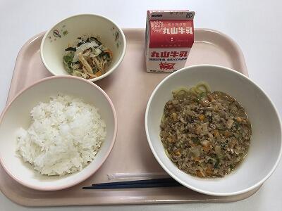 今日の給食は、わかめごはん、のり、チリコンカン、ごぼうサラダ、牛乳でした。