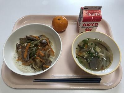 今日の給食は、麦ご飯、チンジャオロース、小松菜のごま和え、牛乳でした。