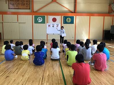 今日は6月の全校集会でした。校長の話のあと、6月の担当の養護教諭の先生からのお話でした。お話は、6月4日(むし歯予防デー)に関するお話でした。手作りの紙芝居を使って、「磨くんじゃ-!」と題して、歯の磨き方について分かりやすくお話をしていただきました。