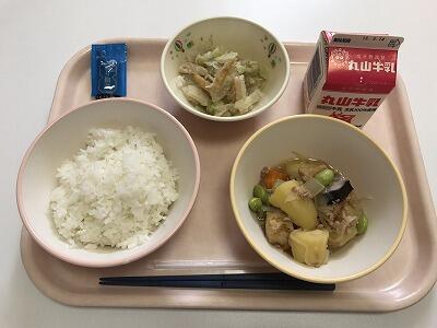 今日の給食は、麦ご飯、魚のピリ辛揚げ、白玉団子汁、枝豆、牛乳でした。