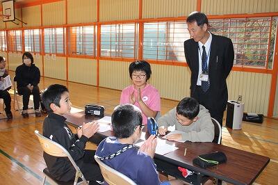 はじめに1年生が、2学期にがんばったことを発表しました。文字をきれいに書くこと・生活科でのスイートポテトづくり・持久走大会の3つについて話しました。校長からは、今年一年のがんばりをほめ、来年も目標を立ててがんばろうという話をしました。「かぞえ年」の話に子どもたちは驚いていました。また、2学期に国語で学習した内容からのクイズもしました。