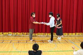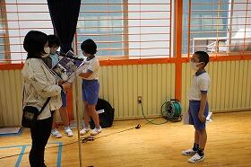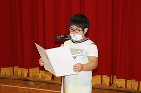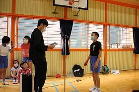 1学期の終業式が21日にありました。児童代表で3年生が友達と協力してカブトムシを育てたこと、水泳のバタ足の練習をがんばったこと、タブレットが上手に使えるようになったこと、姉妹で仲良くできたこと等、1学期にがんばったことの発表をしました。その後、校長から1学期の振り返りと平和の大切さについての話がありました。式の後、7月いっぱいで離任される用務の先生とのお別れ会がありました。72日間の1学期が終わりました。みんな元気にがんばってくれました。8月30日に26人の元気な顔を見るのが楽しみです。