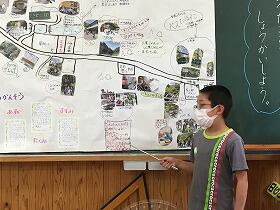 先月3年生が尾前地区を探検したことを写真や自分の感想を交えて地図にまとめました。今日はその発表会で、子どもたち1人1人が自分の担当施設を説明しました。保育所の年齢別の子どもの数の報告やお店でのレジ打ち体験など、見たこと、聞いたこと、体験したことを詳しく説明できました。自分たちの住んでいる尾向地区の再発見ができたようです。