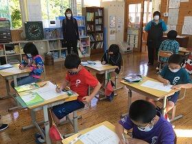 参観日を実施しました。教科の学習や夏休みの研究発表、タブレットの活用など、それぞれの学級で子どもたちが活躍しました。3・4校時は延期になっていた世代間交流でした。コロナウイルス感染対策のため内容を一部変更し、鼓笛発表とひえつき節の踊りの講習を実施しました。参加していただいたおじいちゃんやおばあちゃんは鼓笛の発表に感動している様子でした。ひえつき節の踊りは短い時間でしたが、おじいちゃんおばあちゃん方が丁寧に教えてくださったので子どもたちはしっかり踊れました。その後、給食の試食をしていただきました。有意義な交流ができました。