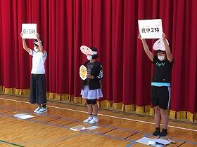 保健委員会の発表がありました。テーマは「睡眠」についてです。午後11時以降に就寝する子どもが7人、朝ご飯を食べてこない日がある子どもが7人という無記名アンケートの結果を受けての発表でした。子どもたちは、映像と寸劇で睡眠と朝ご飯の大切さが理解できたようです。地域によっては神楽の練習も始まっているようなので、時間を有効に使うことについても指導しています。