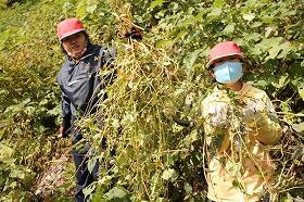 秋晴れの空のもと、焼畑体験学習「収穫」を行いました。今回は、椎葉中学校の2年生も一緒に取り組みました。焼畑地には7月30日に蒔いたそばがたくさんの実を付けていました。1~4年生ははさみを使い、5・6年生は鎌を使って収穫します。斜面に気を付けながら安全に作業できました。刈り取ったそばは棒で叩いて実を落とし、何回もふるいにかけ、昔の道具であるとうみに入れて軽いものは飛ばし、実だけを取り出します。長年続けてきた学習なので、子どもたちも慣れた手つきで作業に取り組みました。「火入れ・種まき」から「収穫」まで、地主様や保護者、地域の方々のご理解とご協力がありました。ありがとうございました。11月24日の「収穫祭」に向けて諸準備に取り組んでいきます。
