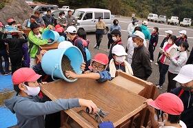 24日(水)に焼畑体験学習「収穫祭」を実施しました。今年は新型コロナウイルス感染予防対策と食物アレルギー対策のため、発表会とそば作り体験を入れ替えての実施となりました。保育園児、中学生、小学生それぞれ趣向を凝らした発表を行いました。小学生は「りんたろうといのちの種」の絵本の劇に取り組み、自然の恵みや焼畑を伝えていくことの大切さを伝えました。その後、そば作り体験で地域の方々からそば打ちやそば切りなどを教えてもらいました。石臼を使っての粉挽きも体験しました。昼過ぎからは、そばの試食をしました。そばをはじめ、椎茸、ゆず、猪肉等、地元の産物を使ってものでとてもおいしくいただきました。7月のやぼきりから収穫祭まで、たくさんの方々にお世話になりました。ありがとうございました。
