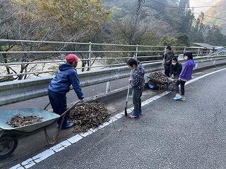 その前に、子供たちは朝早くから校舎前や学校前の道路を落ち葉はきです。