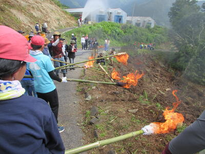 6年生が火入れを行いました。斜面の上側に火をつけました。