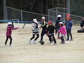 5時間目、運動場には冬の穏やかな日差しの中、3・4年生の元気な声が響いていました。今日の体育はボール運動でサッカーをしていました。