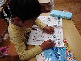 2時間目の授業を覗いていみると、1年生と5年生が算数の授業の中で、今年算数の活用力を伸ばすためにPTA予算で購入させてもらった問題集に取り組んでいました。導入→習得→活用→探求と4段階で学べる問題集ですが、子ども達は問題が解けて丸がもらえるととてもうれしそうでした。