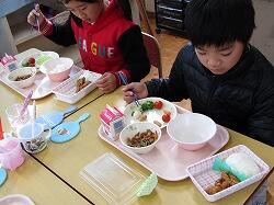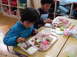 唐揚げ、ウインナー、ウズラの卵等、子ども達にとっては大好きなおかずばかりで、楽しそうに弁当の入れ物に詰めていました。