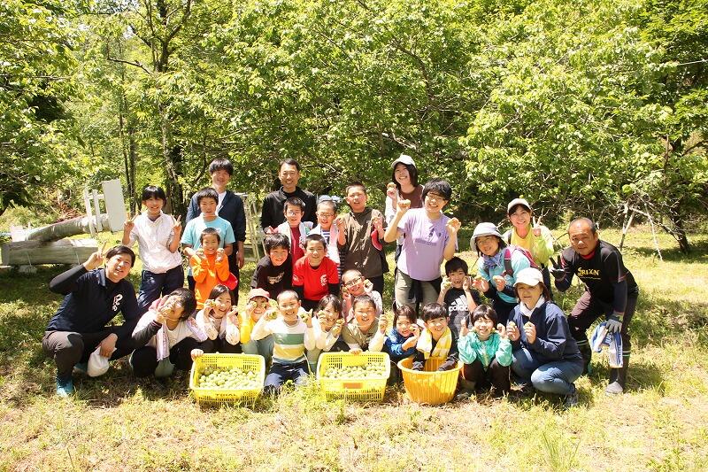 6月7日、毎年恒例の梅ちぎりに行きました。場所は、尾向小学校跡地(森の遊園地)です。天候を心配していましたが、奇跡的(!)に青空が広がりました。