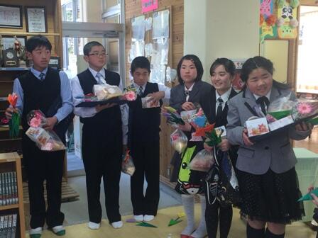 ・ 25日に挙行しました。今年は6名の心身共にたくましく成長した卒業生が、元気に巣立っていきました。児童館同様、保護者はもちろんのこと、地域の皆さんや卒業生の保護者以外の保護者も来て下さり、大勢が祝福していただく中、感動のある式で終わる事が出来ました。これまでの担任であった諸先生方、VTRをどうもありがとうございました。皆さん、懐かしそうに見て下さいました。また、メッセージを下さった方々も本当にありがとうございました。皆さんのおかげで、卒業生は感動の中、元気に巣立っていきました。