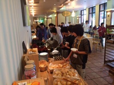 *夕食バイキング~待ちに待った夕食バイキングです。自分の好きなものを選んでいます。