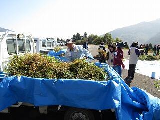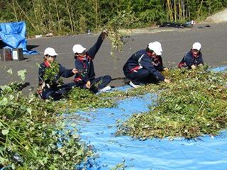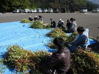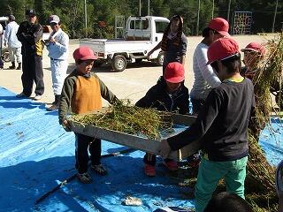 早朝から、保護者、地域の方々、椎葉中学校の2年生等たくさんの方々の協力をいただき、午前中は急斜面での収穫、午後は学校での「脱穀」と終日をかけての作業でした。