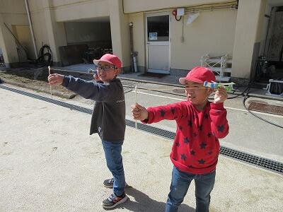 3年生が理科で飛行機を作って飛ばしました。「おもちゃランド」という最後の単元で、これまで学習したことを生かして遊ぶ学習です。今年は、ゴムの力を使った飛行機を飛ばすことにしました。