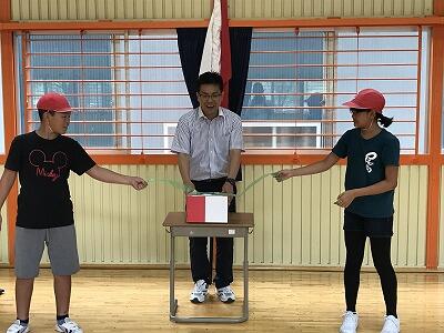 赤、白分けは、ジャンケンで勝った方が、好きな方のビニールテープを選び、せーので引っ張って、箱の中から出てきた、色のカードがそのチームの団の色となりました。